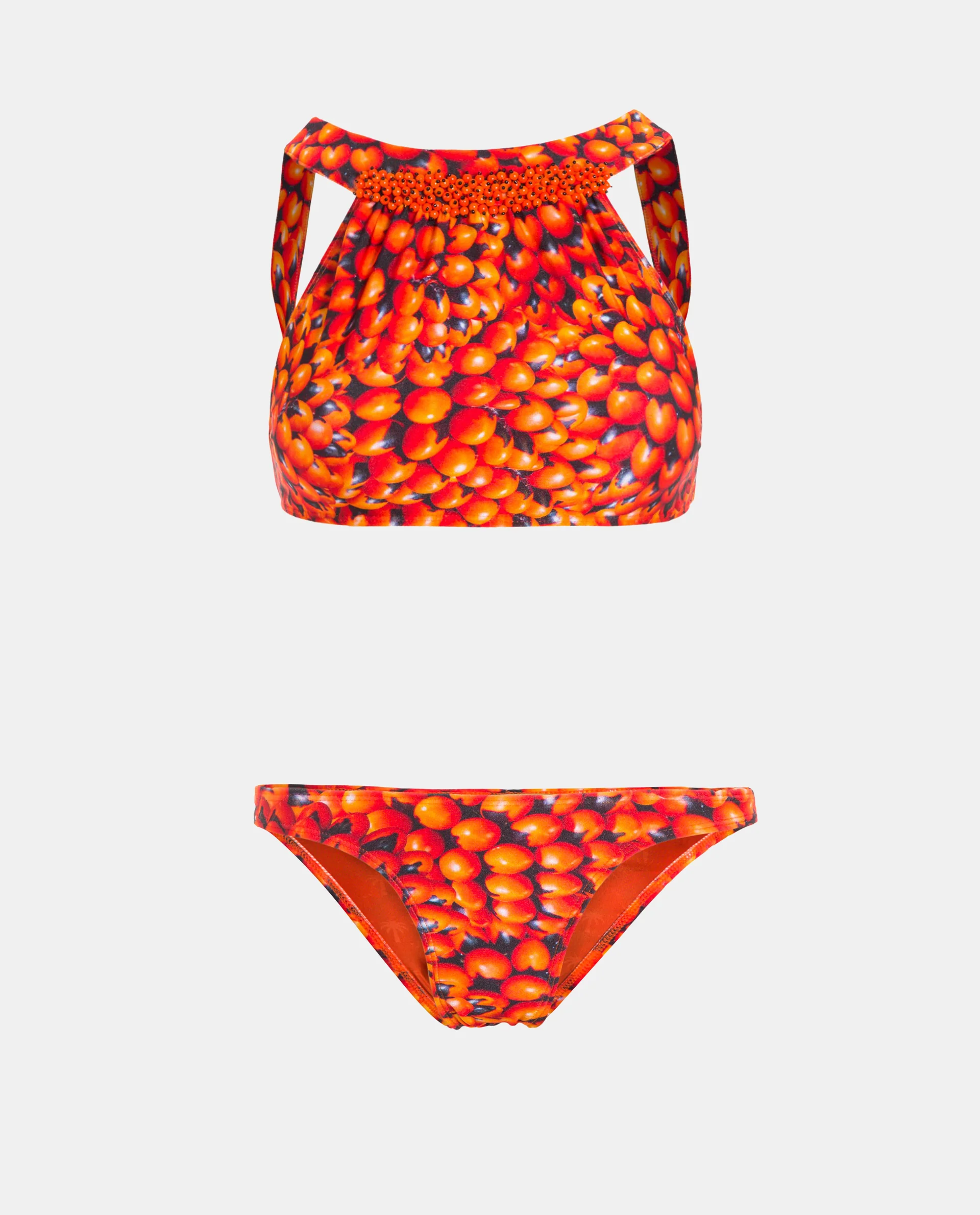 Printed bikini with halter neckline and beaded details. Mettalic clasp closure on the bak. Fully lined. Basic low waist bottoms.