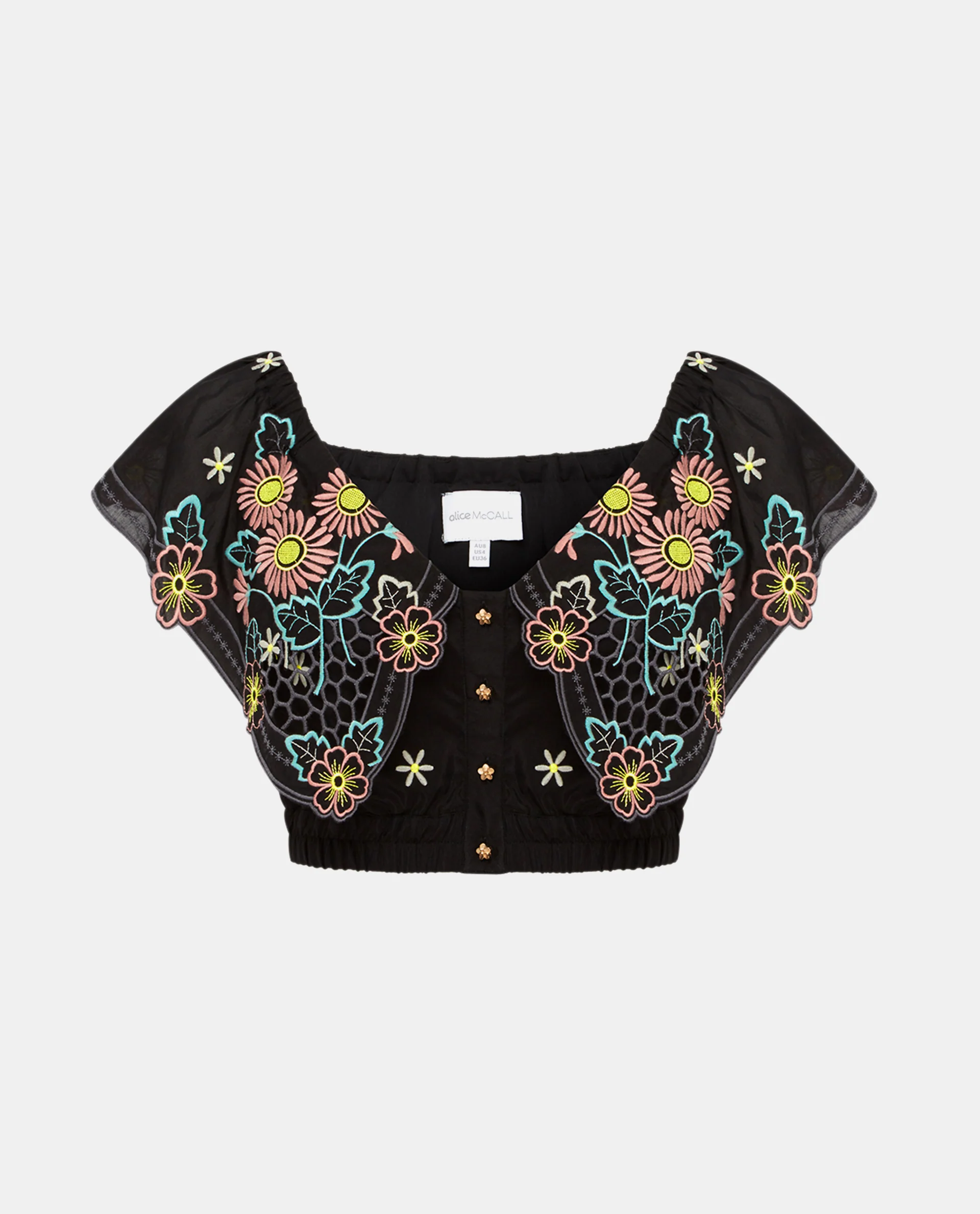 The Alice McCall Honeycomb Daisy Crop Top off shoulder features a beautiful gold metal hardware. This top is designed with an elastic at the waist giving it a flexible fit. Pair this Alice McCall crop with wide leg pants for a perfect look. - 4 bottons at front - Elasticated at the shoulders and waist.