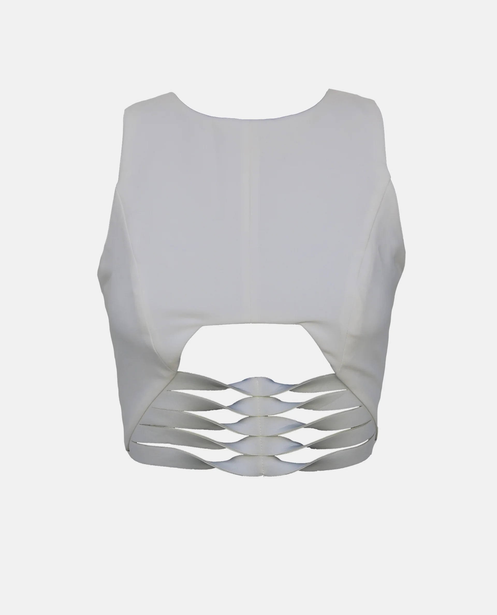 The white crop top features a cut out midriff with spine detailing. The unique detail on the Muscan crop top makes this a stand out piece. The crop top has a concealed zip at the back. The thick material creates a secure and comfortable fit.