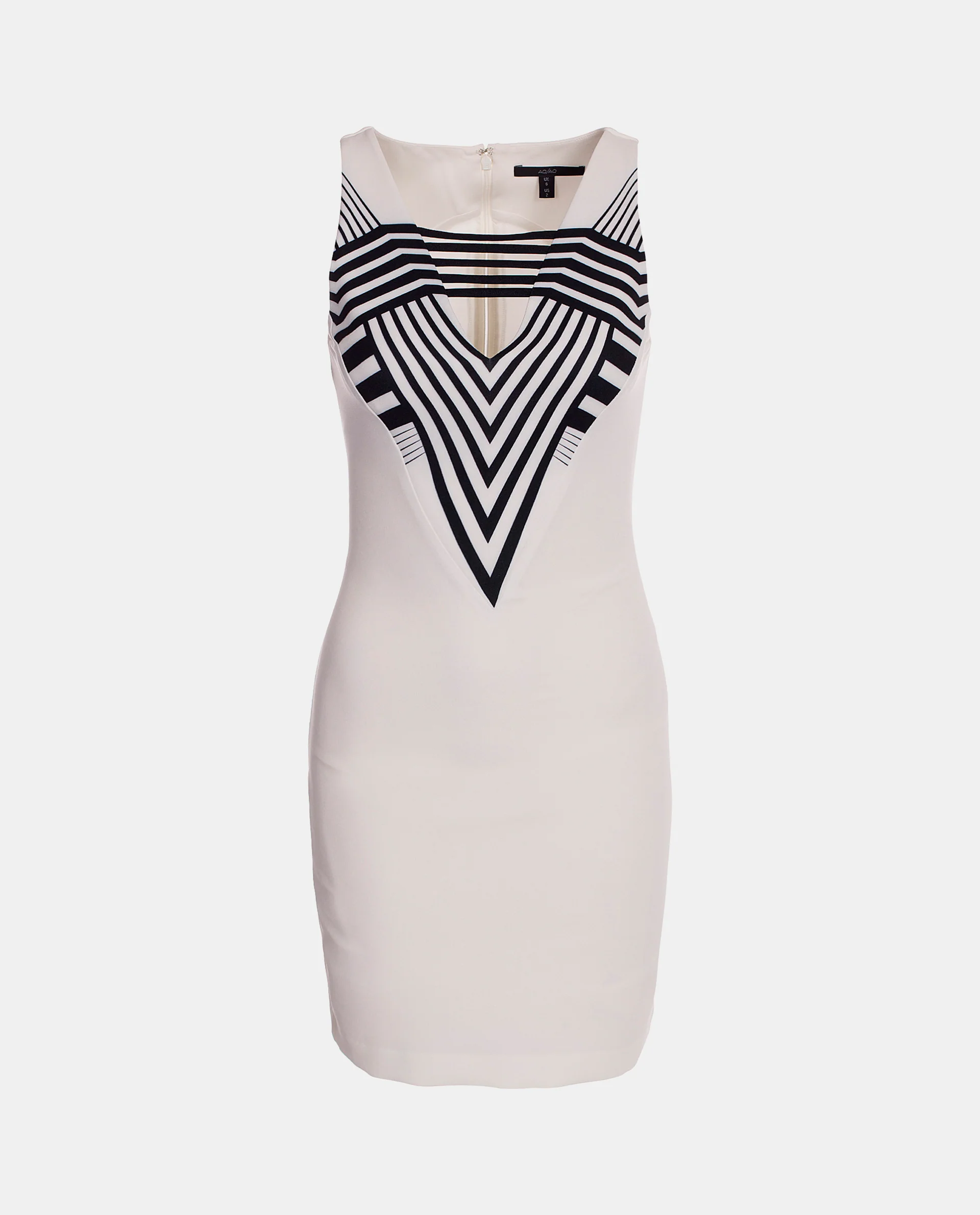 White bodycon mini dress with black printed design which extends across the v front design. Full back makes the mini dress bra friendly and fastens at the back with a concealed zip. The ultimate party dress for Spring. The contrasting, black graphic print gives this little white dress the edge.