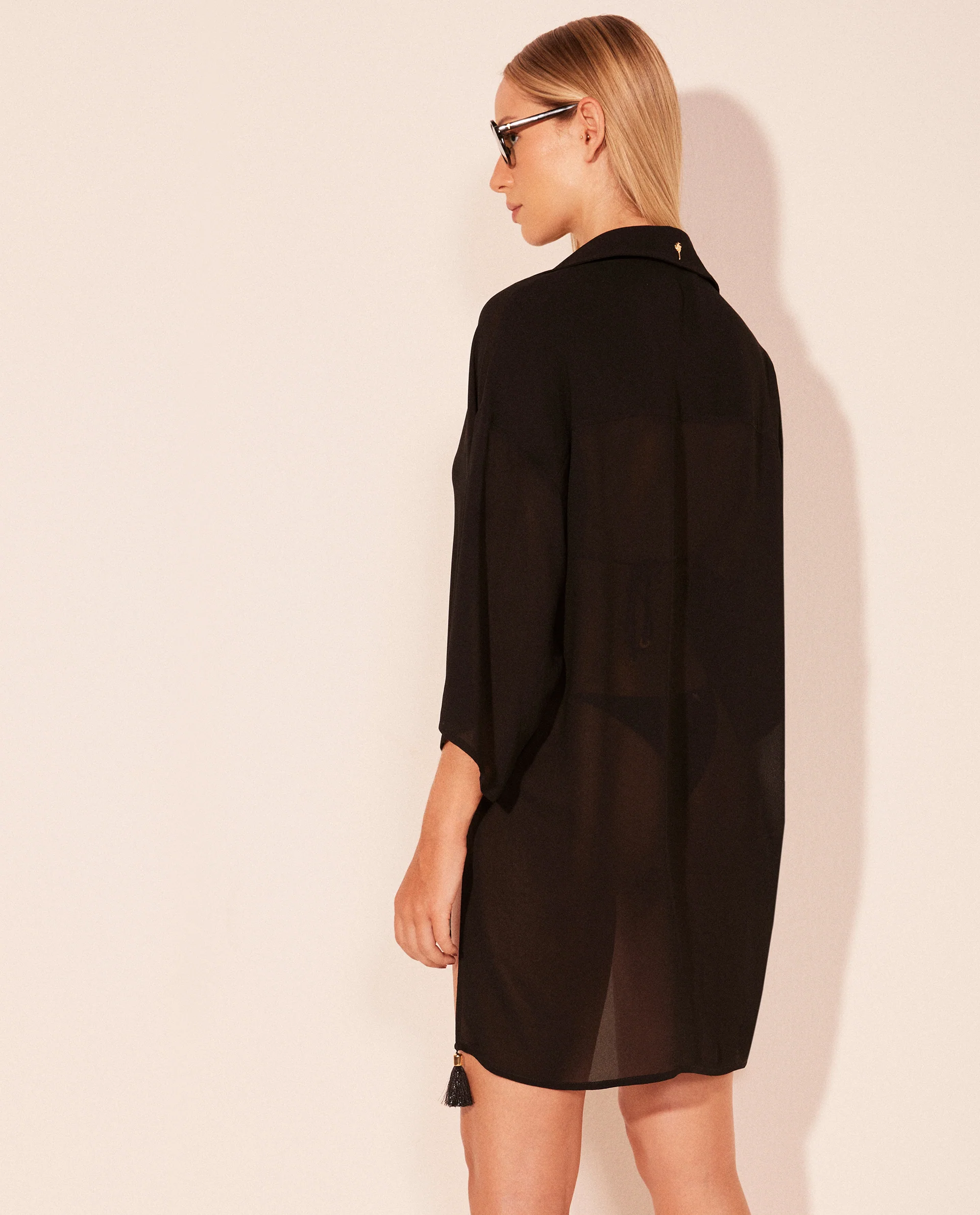 Crafted in a lightweight, semi-sheer fabric, this relaxed silhouette features a classic shirt collar, front button closure and fluid three-quarter sleeves. The asymmetric hemline adds movement, while delicate tassel details bring a subtle bohemian touch.