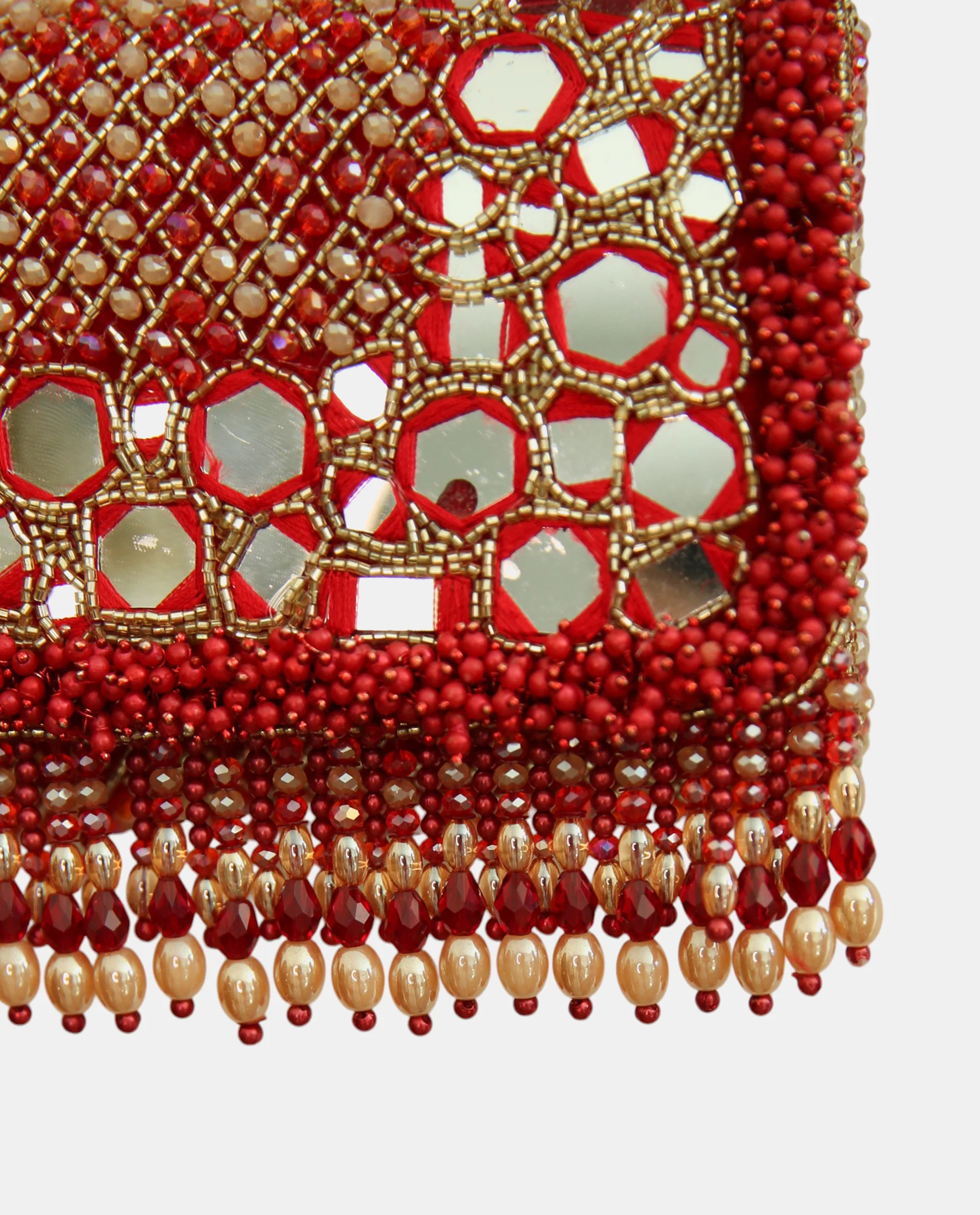 This vibrant red bag sparkles with mirror work and glass beads. The bold color and intricate detailing make it the ultimate party accessory.