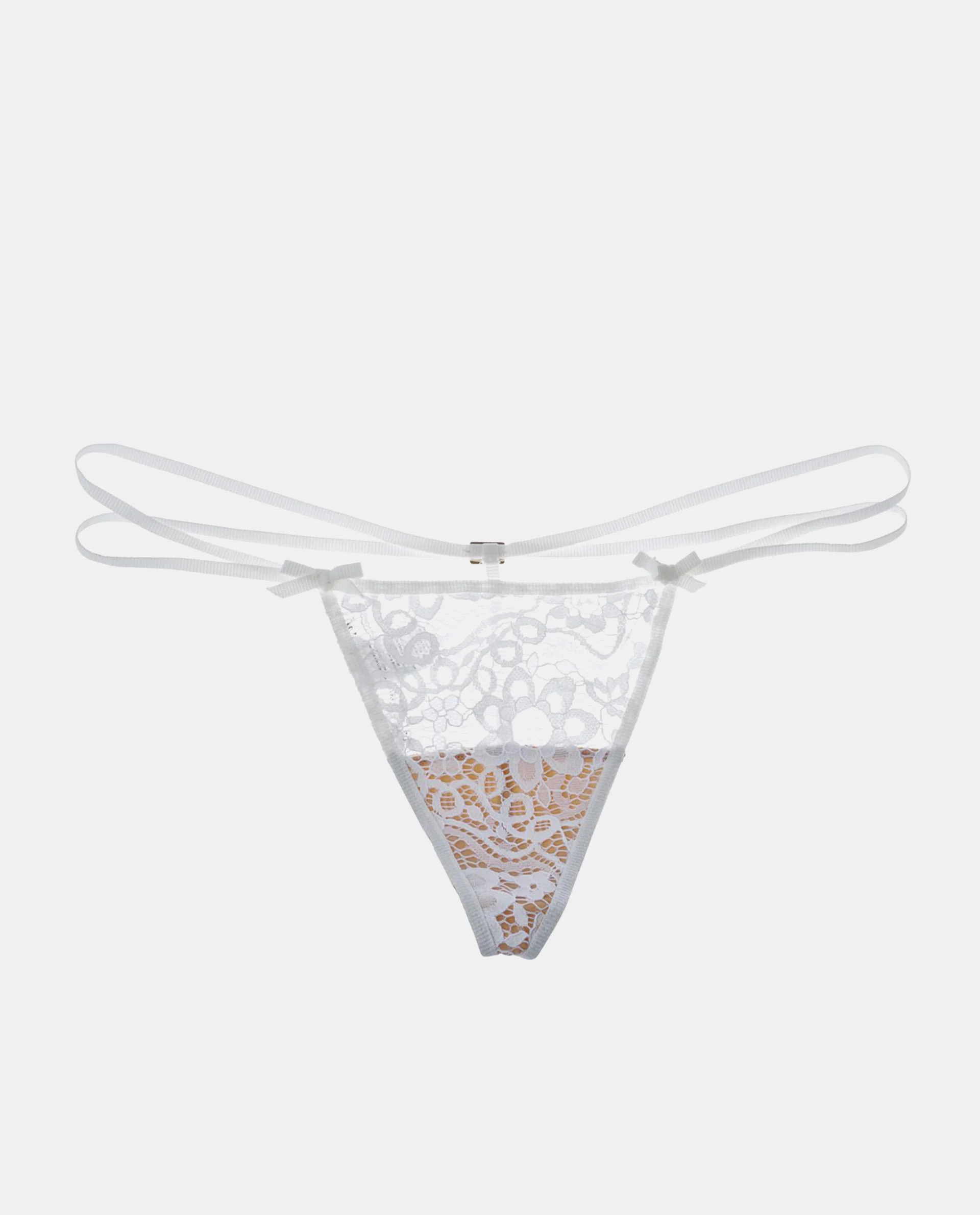 They'll never know how much trouble they're in. The Kate Thong by SKIVVIES by For Love & Lemons comes in white lace and features double ribbon waist, bow detailing at front, classic thong silhouette, and beige panel at bottom.