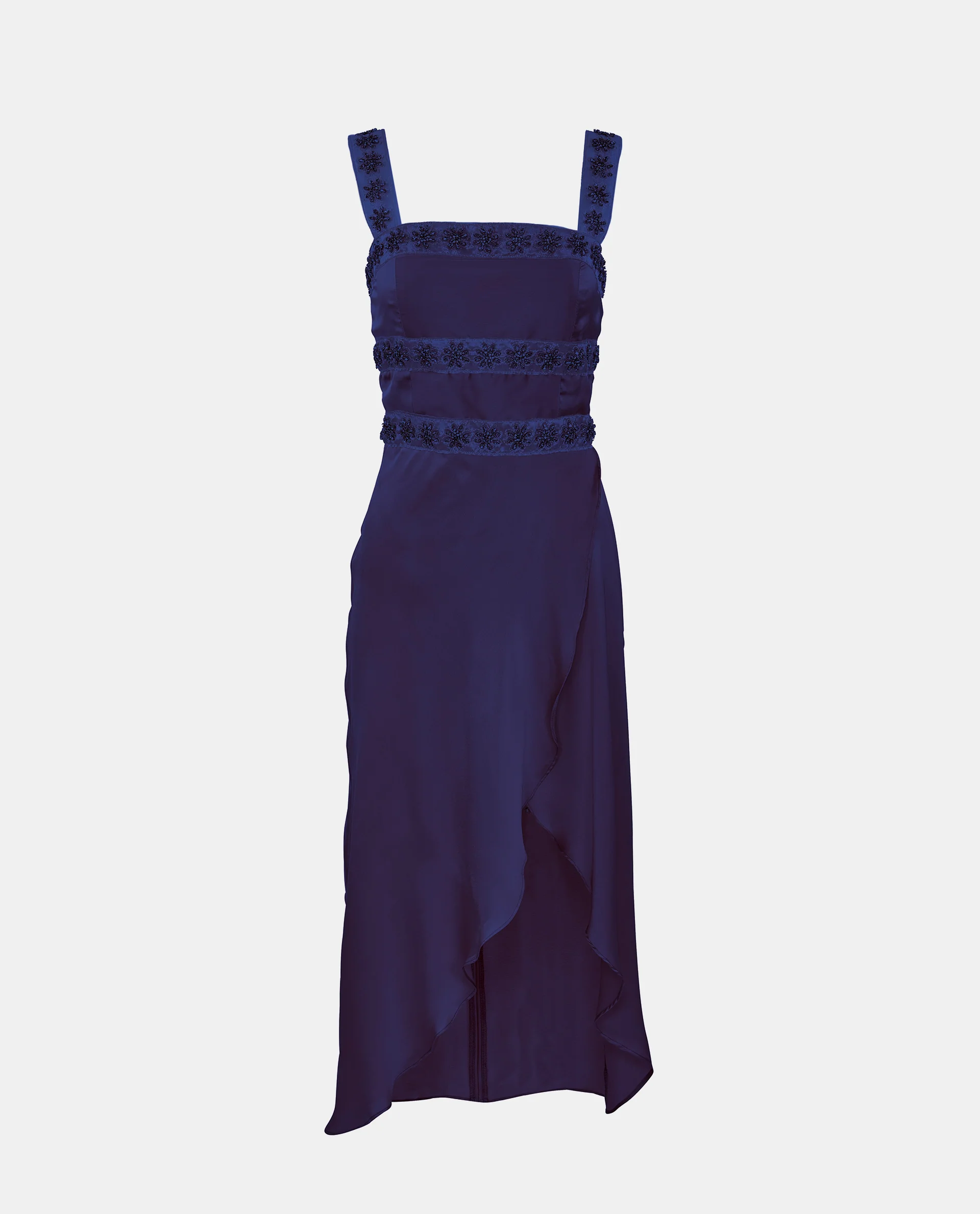 With a renewed lust for vintage, we made the Opal Beaded Midi Dress. This silky satin midi dress was made for those sultry nights with its alluring slit and hand beaded crystal flower trim on an opulent organza.