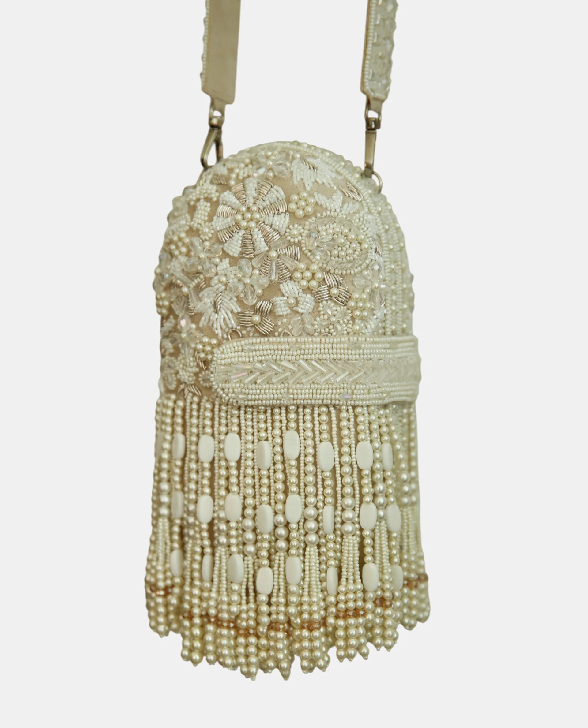 This sophisticated white beaded bag features floral motifs and cascading pearl fringes. An ideal accessory for weddings or festive events, crafted with care to make you shine.
