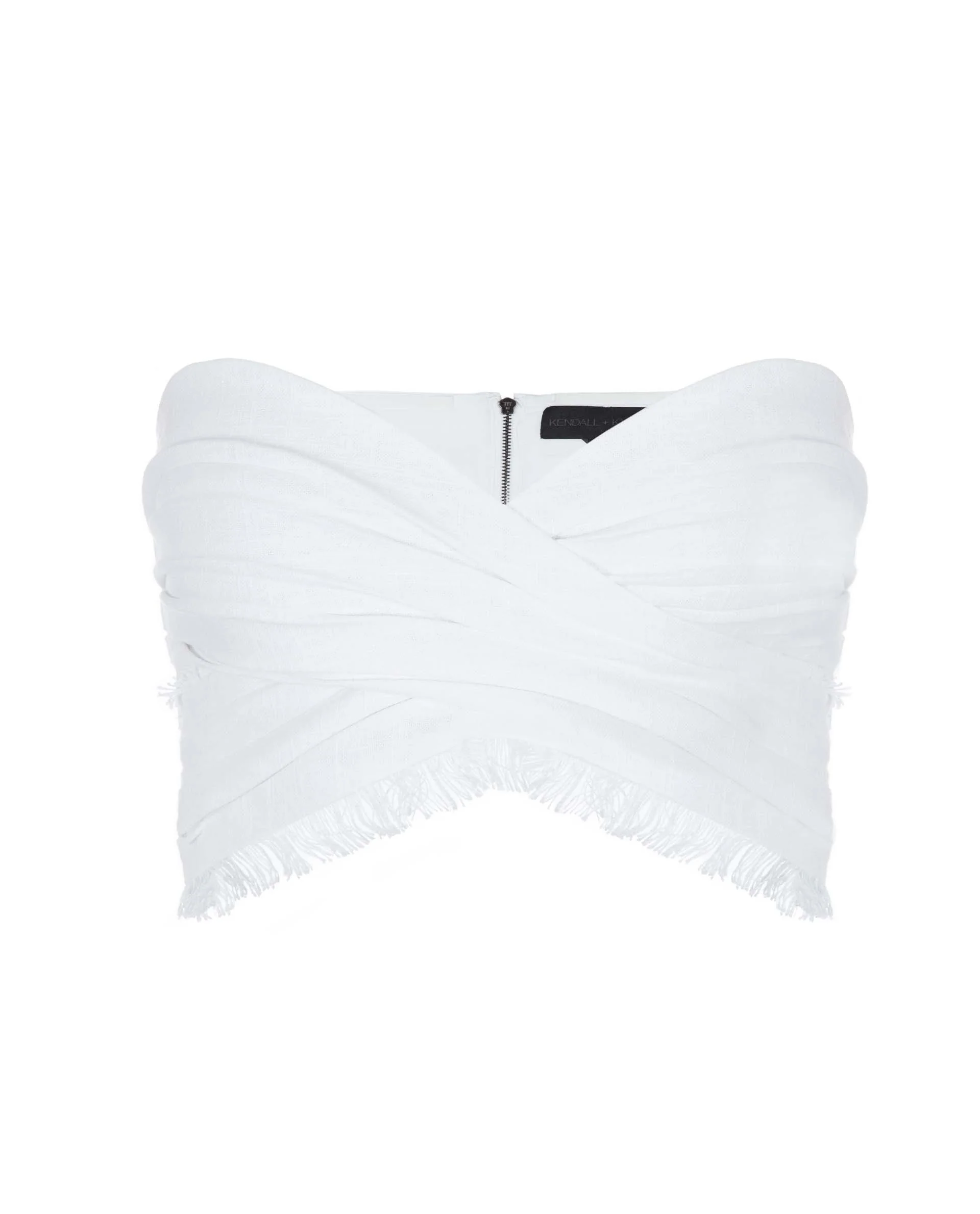 The Kendall + Kylie Frayed Bustier is a pleated crisscross bustier with frayed finish, sweetheart neckline and frayed hem. Zipper closure on the back.