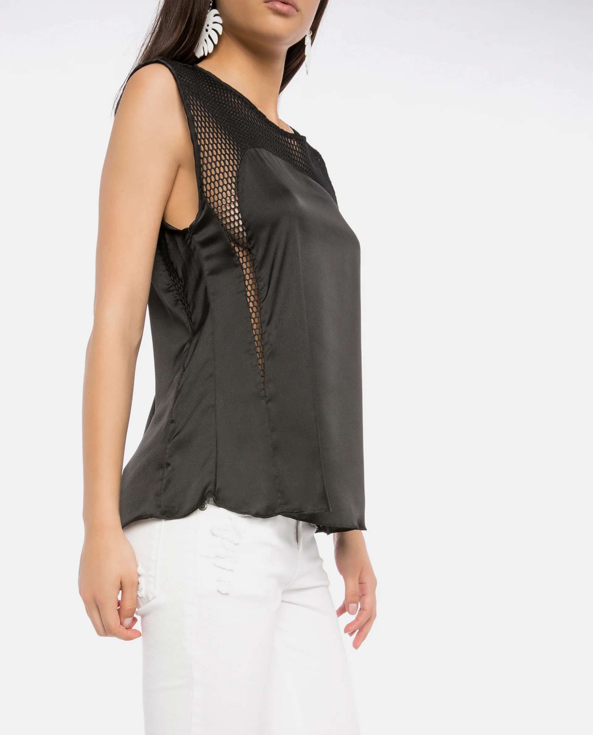Sleeveless blouse with detail of perforations on the top panel. Small opening at the back and closure with back button.