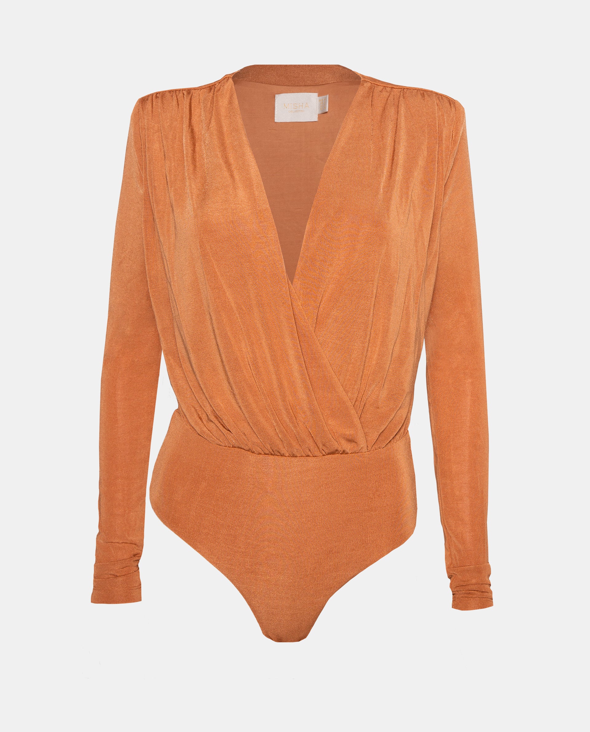 The Misha Collection Jocelyn Bodysuit is the body you'll want to wear whenever you want to feel special and sexy. With a draped front and a V neckline, this piece will accentuate your curves in all the right places. Pair this Misha Collection body with a high waist bottom. If you prefer, we have it as a jumpsuit as well! - Nonfunctional Wrap Front - Elasticised Waist - Snap Buttons and Gusset at Crotch