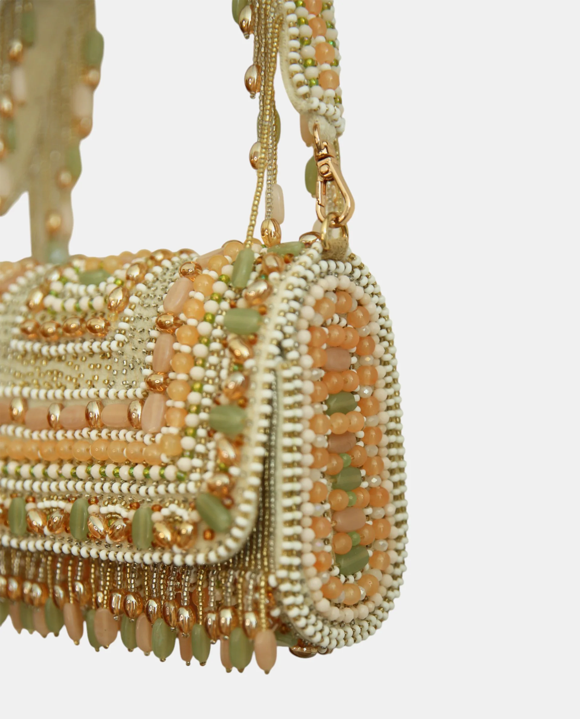 A pastel-toned masterpiece featuring soft pink, green, and white beads. Finished with delicate pearl tassels, it adds a whimsical touch to any outfit.
