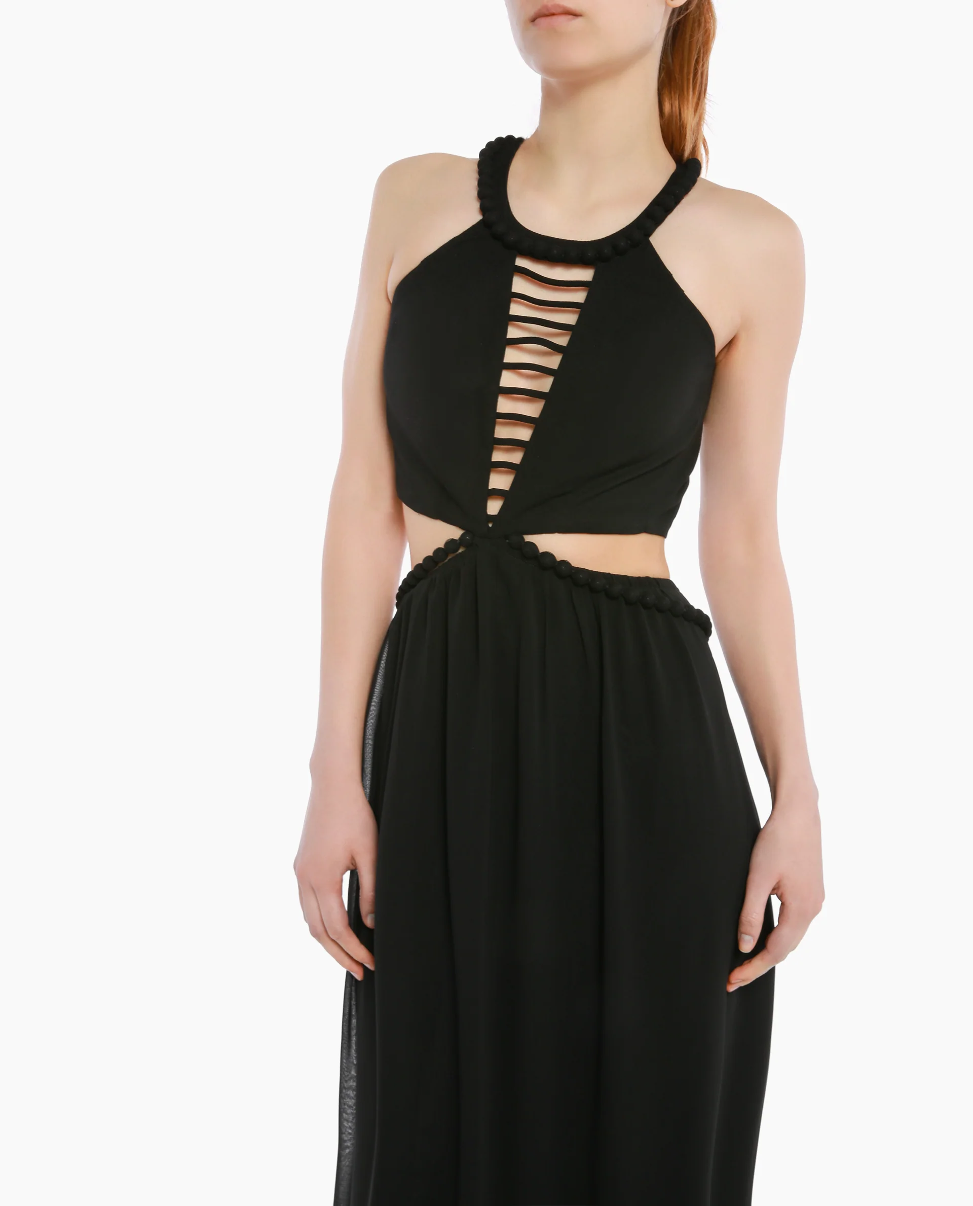 Maxi dress with open back and cut-outs on the waist, halter neckline. This flowy dress makes a flattering effect, ideal for a special occasion.